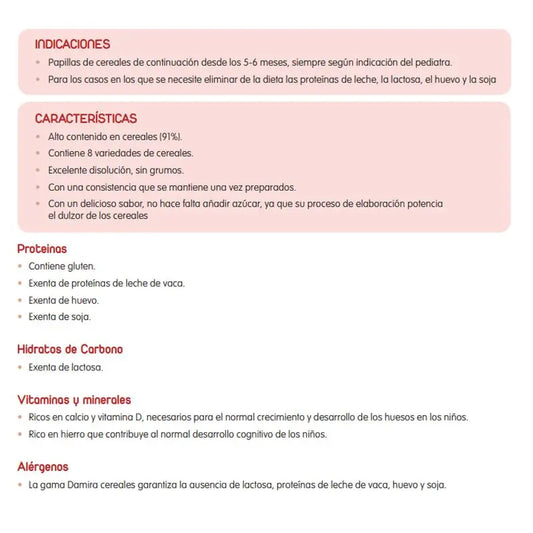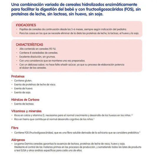 Damira' s food products are created to help babies and children who suffer from any kind of intolerance to be able to feed themselves without any problem. Within its range of products, you can find different types of Damira Cereal porridges depending on the needs of the child and their age. An example is the 8 Cereals FOS porridge which does not contain traces of soya, milk protein, lactose or egg, with normal flavour, with honey or with maria biscuit; or the cereal porridge without gluten, or any of the previous traces.