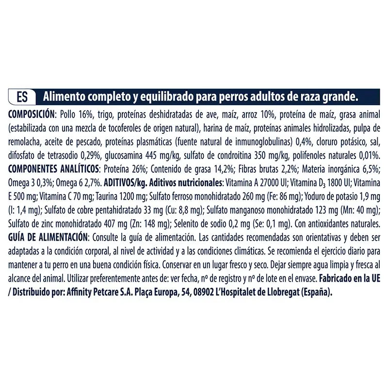 ADVANTAGES: Suitable for the good nutrition of adult dogs, from 2 to 6 years old, large breed. Reduces the negative effects of oxidation and delays cellular ageing. Prevents the appearance of joint problems. Contains taurine and omega 3 to improve heart and central system health. Chicken and rice provide the necessary proteins for a balanced nutrition.