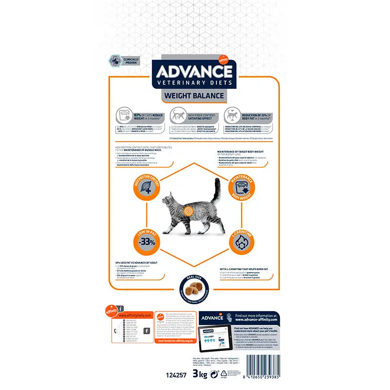 ADVANTAGES OF ADVANCE WEIGHT BALANCE FEED: Feed for cats with obesity. Helps to control weight. Reduces up to 23% fat in 3 months. Provides a satiating effect. High in protein and low in fat. With L-Carnitine to burn stored fat. With antioxidants and citric acid. With omega 6 fatty acids and Biotin for healthy skin and hair.