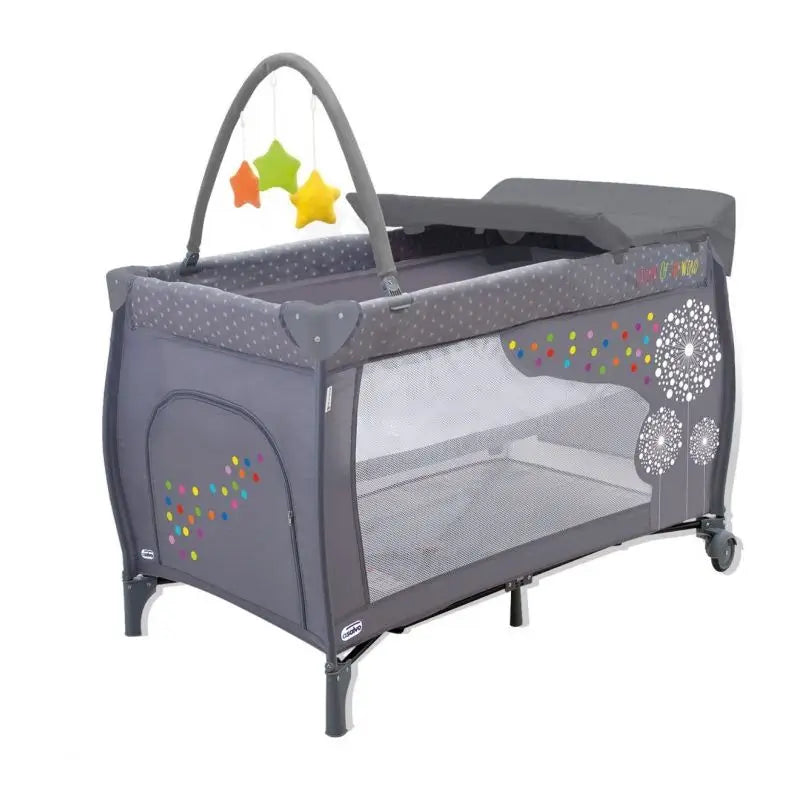 - From 0 to 15 kg - 2 opaque sides and 2 mesh sides - 2 wheels with brake - Very compact folding - Water resistant - Padded base - Carry bag - Solid design - Double safety lock - Coloured plastic corners - Coloured box - Includes: Double Layer, toy bar, toy bag, padded base, zipped entrance, changing mat, table and carry bag - Includes illustrations on cot and padded base - Double height up to 6 months - Changing mat up to 11 kg - Cot up to 15 kg.