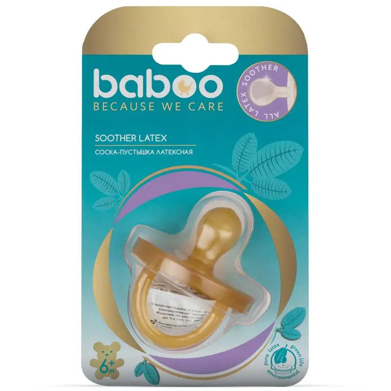 Latex soother, 0+ months. USE: Sterilise in boiling water for a maximum of 5 minutes before first use and each use. Do not use abrasive cleaning products. Can be sterilised in a special steam steriliser. Do not heat in the microwave. Dishwasher safe. Do not leave in heat or direct sunlight. Check before each use. If you notice any damage, replace it with a new one. This product is not a toy. Keep out of reach of children when not in use. Not recommended for use for more than 2 months. The packaging is not part of the product. Further information: www.baboo.baby. Country of origin: Thailand. Importer - UAB Sentija, Tuskulėnų 13A-22, Vilnius, Lithuania, baboo@sentija.com.