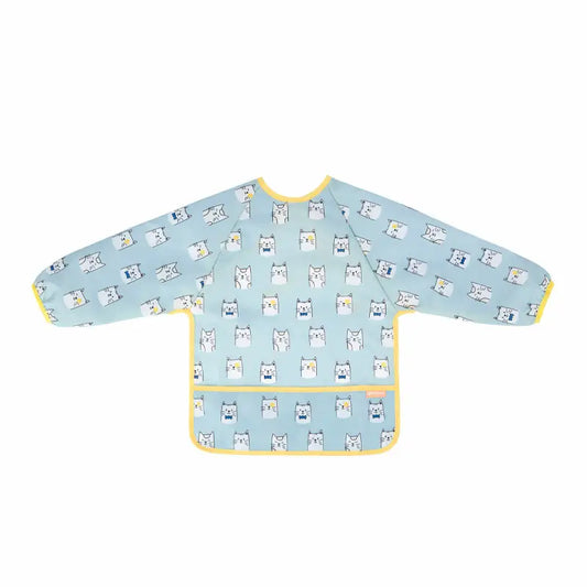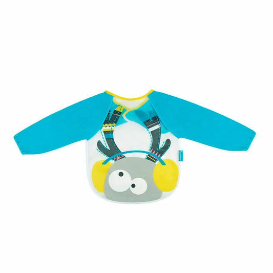 First, insert the baby's arms into each sleeve of the bib, as if it were a normal garment. Then adjust the neck loop according to the size of the child. At this point, care should be taken to ensure that it is not too tight, as this may be uncomfortable for the child when swallowing food. It should be tight enough so that it does not stain clothes and loose enough so that the baby feels comfortable.