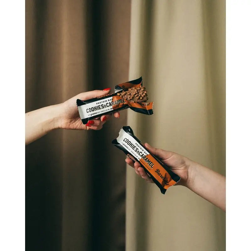Barebells Bars Cookies and Caramel is a 55g protein bar that combines a delicious biscuit and caramel flavour with a smooth and creamy texture. It is an ideal choice for those looking for a tasty, high-protein snack with no added sugars.