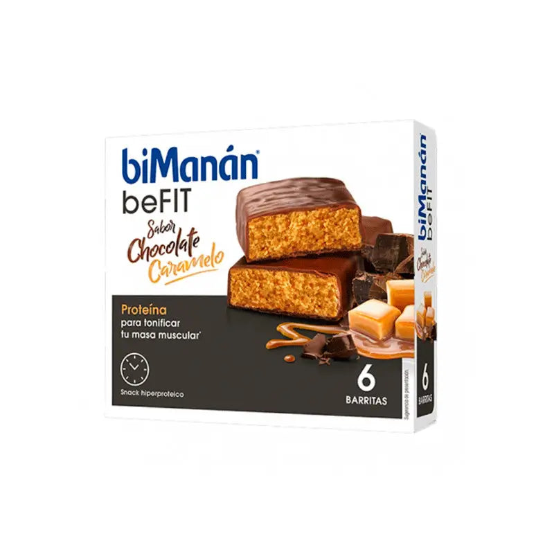 The biManán Pro chocolate and caramel bar is a snack food with a high protein content, which promotes muscle development along with a healthy lifestyle and reduces the risk of muscle degradation.