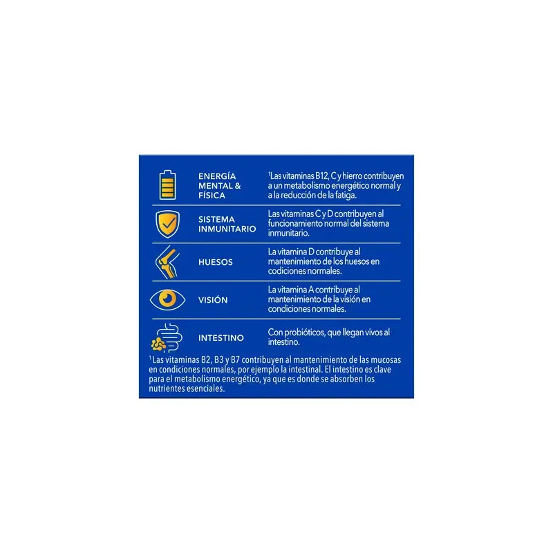 With 3 probiotics, 12 vitamins and 7 minerals. Vitamins B2, B3 and B7 support the intestine², Vitamins B12 and B6 support energy metabolism¹, Vitamin C and Iron help reduce fatigue¹.