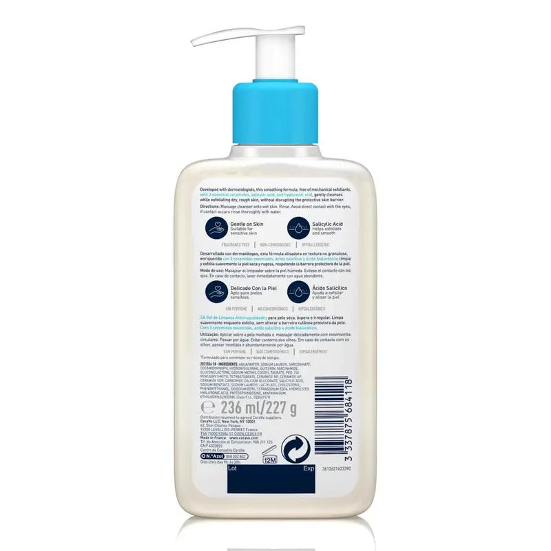 CeraVe SA Anti-Roughness Cleanser contains: AQUA / WATER - SODIUM LAUROYL SARCOSINATE - COCAMIDOPROPYL HYDROXYSULTAINE - GLYCERIN - NIACINAMIDE - GLUCONOLACTONE - SODIUM METHYL COCOYL TAURATE - PEG-150 PENTAERYTHRITYL TETRASTEARATE - CERAMIDE NP - CERAMIDE AP - CERAMIDE EOP - CARBOMER - CALCIUM GLUCONATE - CALCIUM GLUCONATE - CALCIUM GLUCONATE - CALCIUM GLUCONATE - CALCIUM GLUCONATE - CALCIUM GLUCONATE - CALCIUM GLUCONATE CARBOMER - CALCIUM GLUCONATE - SALICYLIC ACID - SODIUM BENZOATE - SODIUM LAUROYL LACTYLATE - CHOLESTEROL - PHENOXYETHANOL - DISODIUM EDTA - TETRASODIUM EDTA - TETRACYCLIC ACID - SODIUM LAURETHANE DISODIUM EDTA - TETRASODIUM EDTA - HYDROLYZED HYALURONIC ACID - PHYTOSPHINGOSINE - XANTHAN GUM - ETHYLHEXYLGLYCERIN (PH.I.L. D235671/1).