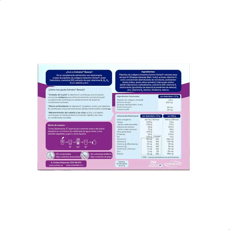 COLNATUR BEAUTY, a powdered food supplement based on Verisol collagen, açaí extract, coenzyme Q10 and other ingredients, designed for the specific care of skin, hair and nails.