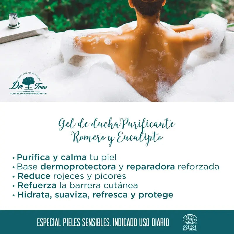 Dr.Tree Purifying dermo-protective cleansing shower gel with ultra-gentle cleansing agents respects the skin's natural hydrolipidic film, and its natural protective actives help protect and strengthen the microbiome. With Rosemary Essential Oil and Eucalyptus ECO. Maximum hydration, reduces redness and itching, soothes and protects. Suitable for sensitive, dull, asphyxiated, dull and dull skin and skin with an oily or combination tendency.