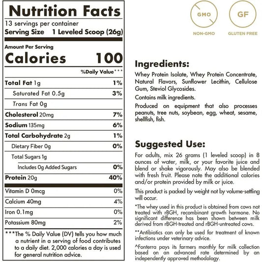 Whey protein isolate by CFMF (Cross Flow Microfiltration) - Emulsifier: soya lectin. May contain traces of cereals containing gluten, eggs, milk and nuts.