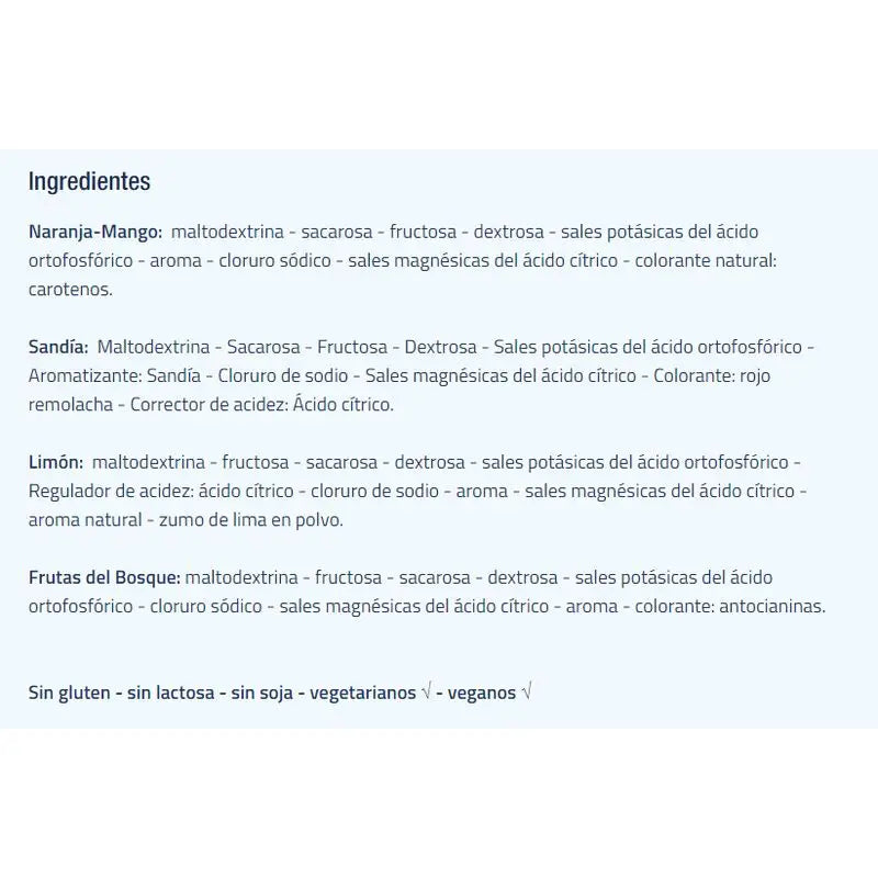 Maltodextrin - fructose - sucrose - dextrose - potassium salts of orthophosphoric acid - sodium chloride - magnesium salts of citric acid - flavour - dye: anthocyanins.