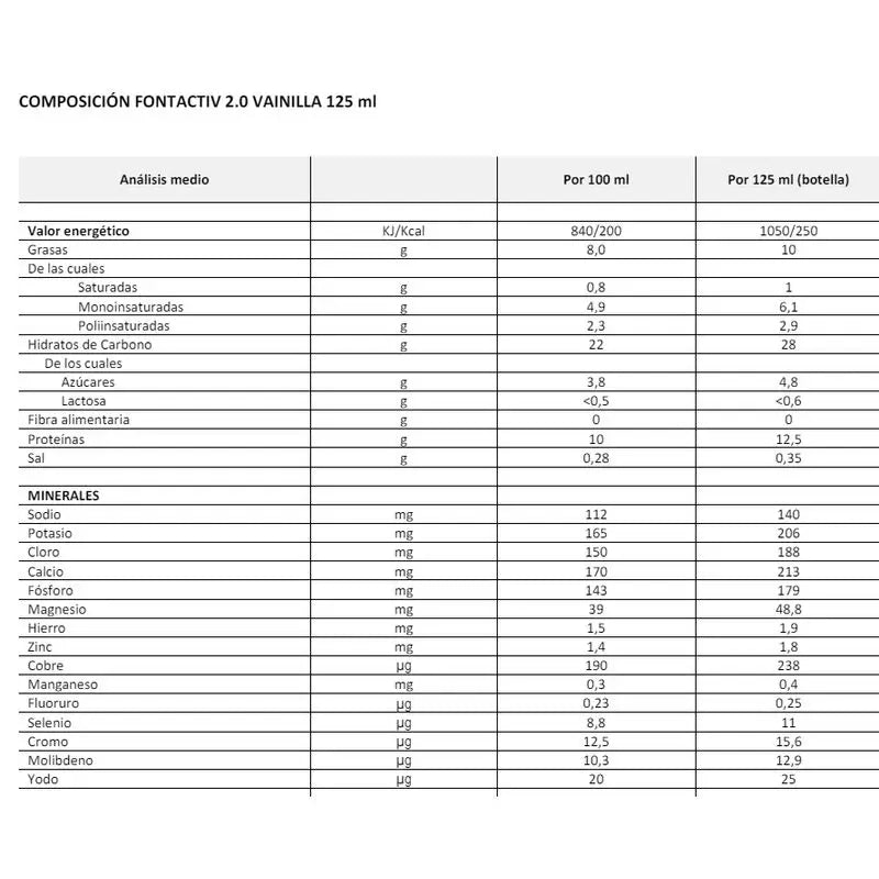 Farmaciasdirect recommends Fontactiv 2.0 vanilla flavour for people who need a good dose of physical energy, as well as for those who suffer from malnutrition, anorexia or involuntary weight loss. It is also effective for covering the nutritional needs of elderly people or people with eating problems in general.