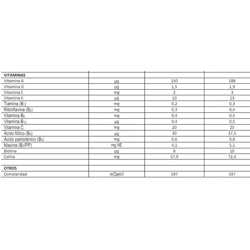 Water, milk proteins, glucose syrup, rapeseed oil, minerals (trisodium citrate, magnesium chloride, potassium phosphate, tripotassium citrate, potassium chloride. sodium chloride, ferric pyrophosphate, zinc sulphate, sodium selenite, manganese sulphate, copper sulphate, sodium fluoride, chromium chloride, potassium iodide, sodium molybdate), emulsifier: mono and diglycerides of fatty acids, flavouring, choline chloride, acidity regulator: potassium hydroxide, colouring agent: beta-carotene, vitamins (ascorbic acid, pantothenic acid, vitamin B2, vitamin B6, vitaminB1, vitamin A, vitamin K1, folic acid, biotin, vitamin D, vitamin E, niacin, vitamin B12. Stabilisers: carrageenan, sweeteners: acesulfame K, sucralose.