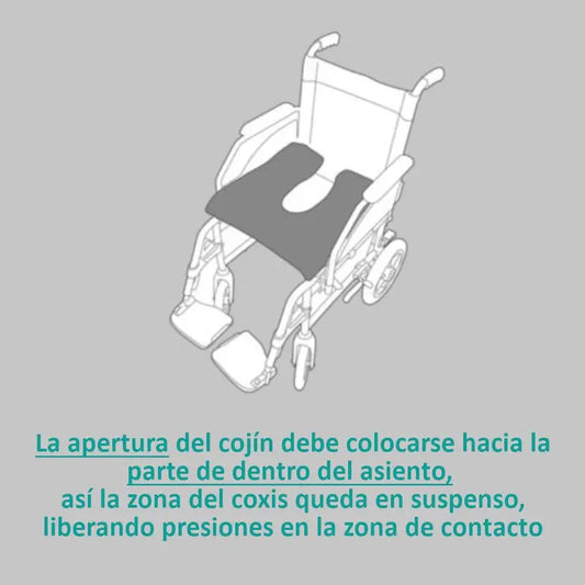 It is very important to place them correctly for them to be fully effective. Their purpose is to leave the coccyx area in suspension in order to free it from pressure. Its characteristics are as follows: Measurements: 46 x 37 x 3 to 7 cm Inner material: Polyurethane foam. Outer material: Polyester Net weight: 350 g Recommendations for use: Designed to prevent the formation of bedsores in people with limited mobility or who must spend long periods of time sitting or bedridden. Recommended for patients with medium sitting. Provides stability. Achieves an even distribution of pressure. Helps to maintain posture by absorbing impacts. Washing is recommended: Always wash periodically by hand at a maximum temperature of 30º and with neutral soap. Do not use abrasive products, solvents or alcohols. Do not hang by its ends. Precautions for use: As it is a flammable product, do not expose it directly to the sun or to a heat source.