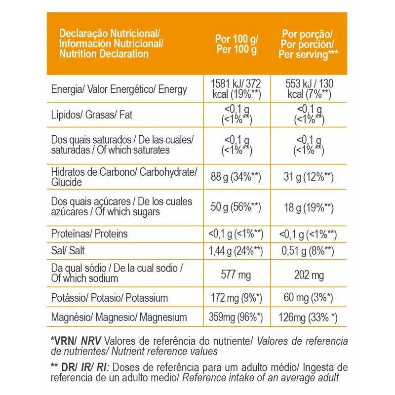 Dextrose [54%], fructose [27%], maltodextrin [10%], magnesium citrate, flavouring, acidity regulator (citric acid), iodised salt, colouring (beta-carotene), potassium citrate. Suitable for vegetarians and vegans. Manufactured in a facility that handles gluten, egg, soya, dairy and fish and may contain traces of these.