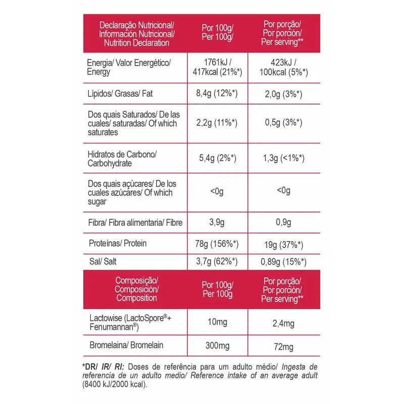 Pea protein (92%), brown rice protein (3%), flavour, colour (beetroot red), Spectra™ (Coffea Arabica, broccoli sprout concentrate, green tea extract, green tea extract, onion extract, onion, onion, green tea extract). extract, onion extract, apple extract, acerola extract, camu camu, quercetin, tomato concentrate, broccoli concentrate, açai concentrate, cauliflower concentrate, garlic concentrate, garlic concentrate).rcuma, concentrado de ajo, concentrado de albahaca, concentrado de orégano, concentrado de canela, concentrado de saúco, concentrado de zanahoria, concentrado de mangostán, concentrado de grosella, extracto de ará(e.g. cherry concentrate, blackberry concentrate, aronia concentrate, raspberry concentrate, spinach concentrate, cabbage concentrate, blueberry extract, Brussels sprouts concentrate), sodium chloride. Suitable for vegetarians and vegans. Manufactured in facilities that handle gluten, egg, soya, dairy and fish and may contain traces of these.