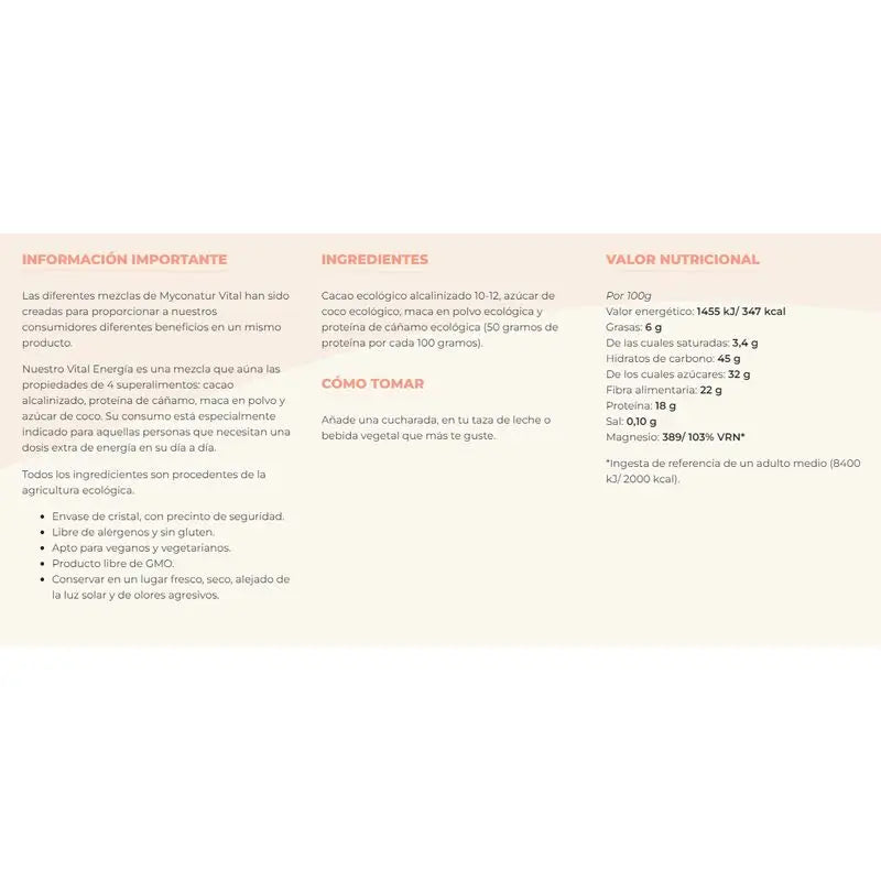 MYCONATUR VITAL ENERGY 180gr. ECO is a product from the online pharmacy that will provide you with a dose of vital energy for your day-to-day life. With natural and organic ingredients, this formula will help you maintain an optimal level of energy and vitality. Its presentation in 180g format will allow you to enjoy its benefits for a long time.