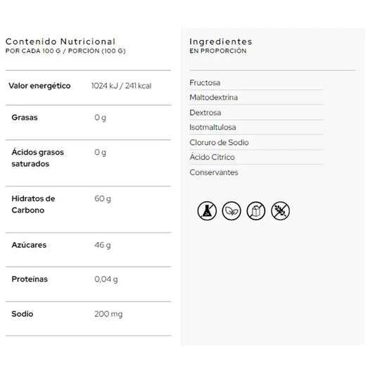 Water; Dextrose monohydrate; Maltodextrin; Crystalline fructose; Cola flavour; Acidifier; Citric acid; Magnesium citrate; Thickener: Xanthan gum; Preservative: Potassium sorbate; Guarana (Paullinia cupana) seed extract (22% Caffeine); Colouring agent: Caramel ammonium sulphite; Potassium citrate; Caffeine; Zinc sulphate; Vitamin B3 (Nicotinamide); Vitamin B5 (D-calcium pantothenate); Vitamin B6 (Pyridoxine hydrochloride); Vitamin B2 (Riboflavin); Vitamin B12 (Cyanocobalamin).