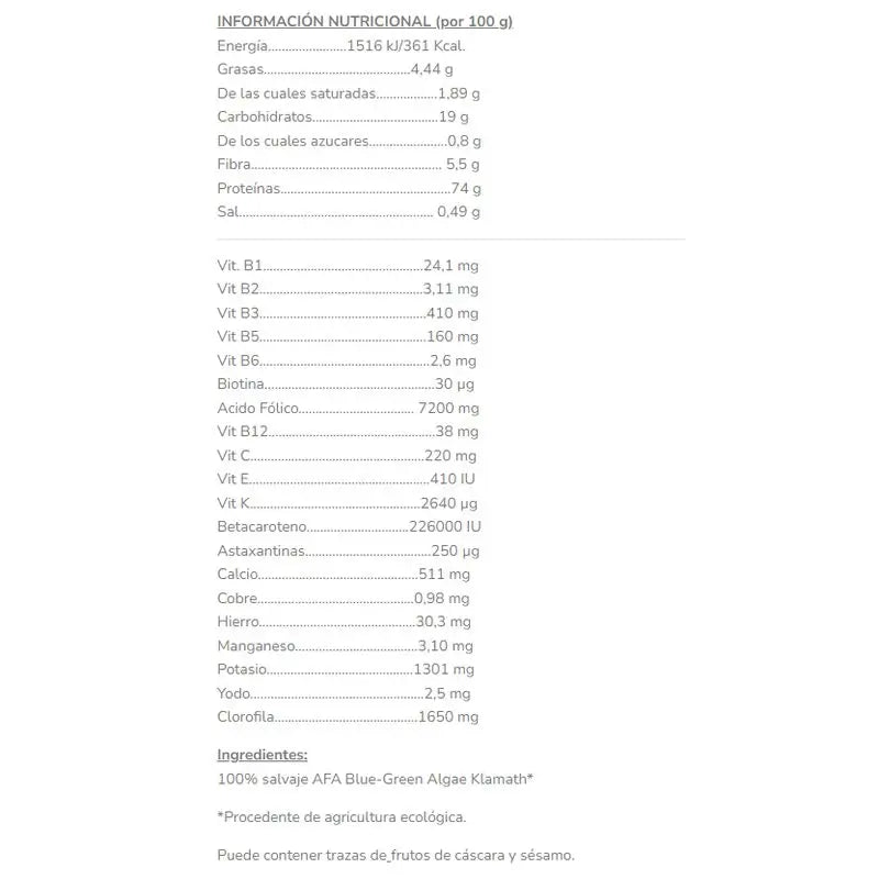 The product "Salud Viva Alga Salvaje Klamath 50Gr. Eco" is mainly composed of wild Klamath seaweed.