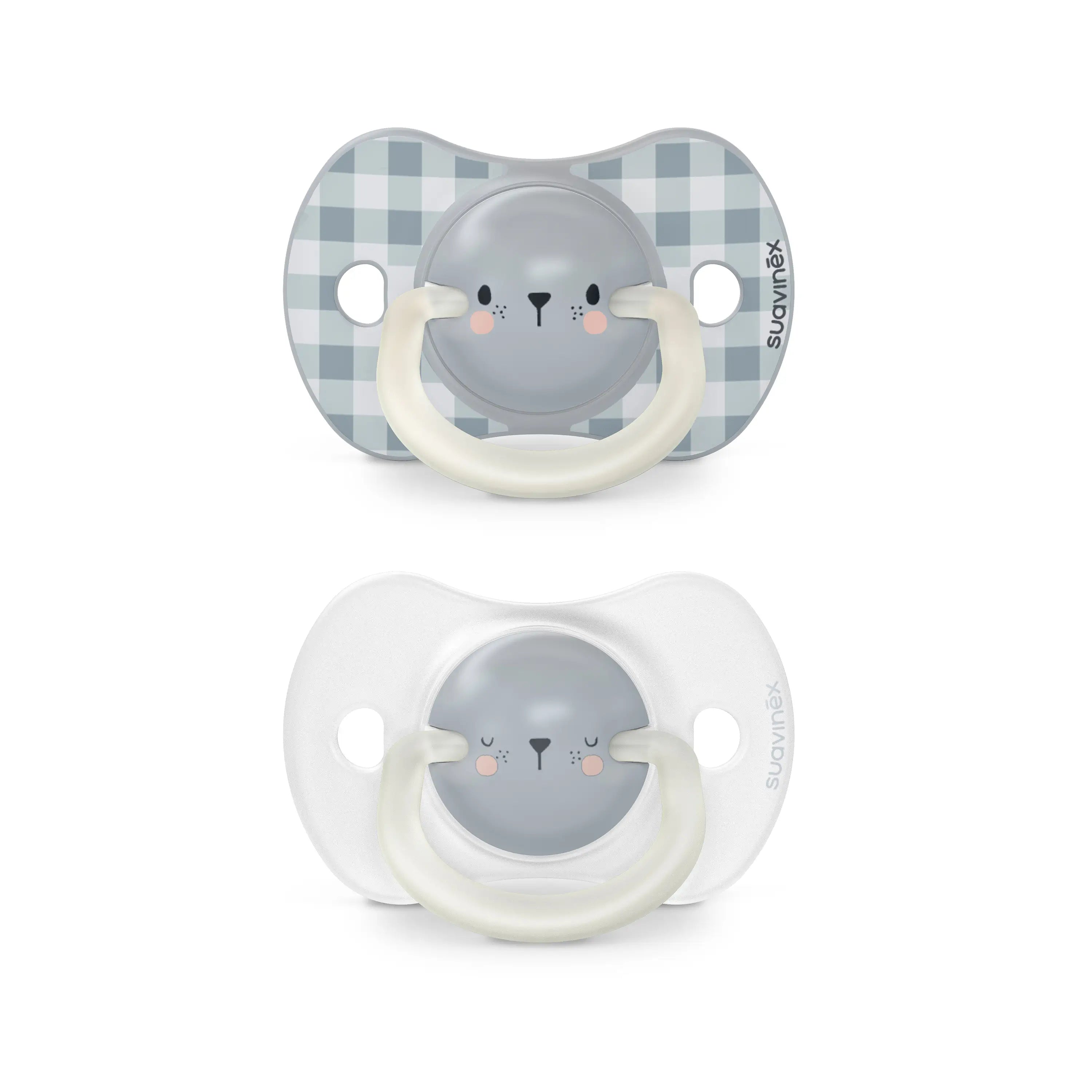 Pack of 2 Night and Day soothers by Suavinex for babies from 6 to 18 months. The set includes 2 glowing soothers, ideal for sleeping. The rings of these soothers glow in the dark, making it easy to find them in the baby's cot or bed without having to turn on the light. Suavinex phosphorescent soothers from the new Night and Day collection, a range of products designed to promote peaceful nights.soothers with SX Pro physiological teat. The SX Pro physiological teat is the closest thing to not wearing a soother and has been designed to respect the baby's oral and dental development. Physiological soother, the most recommended by paediatric dentists*, which leaves more room for the tongue in the oral cavity. The physiological soother is reversible, so there is no problem if the baby turns it upside down. The SX Pro Physiological teat is designed so that it does not invade the oral cavity and gives baby the same sensation he experiences in his natural/physiological state when he is not wearing a soother. The teat is designed taking into account the oral and dental peculiarities of the baby, whose maxilla and mandible are in full development.The Suavinex SX Pro Teat is endorsed by the Spanish Society of Paediatric Dentistry (SEOP). Characteristics of the SX Pro Physiological Teat:100% parent-recommended teat*.Flat and symmetrical teat. It is the shape most recommended by paediatric dentists. It does not matter on which side the soother is placed in the baby's mouth, which reduces the risk of problems in the development of the oral cavity as it is always well positioned.Thinner and wider neck***. Allows the mouth to close almost completely. Better distributes pressure on the gums / teeth.Flatter symmetrical head***. Leaves more space for the tongue to rest.Shorter head***. Makes it easier to bend against the palate.Ultra Soft Sandblasted Silicone. Imitates the texture and consistency of the nipple. It achieves maximum flexibility to adapt to the palate.About us: We are Suavinex, a company specialising in the baby and mother care sector.