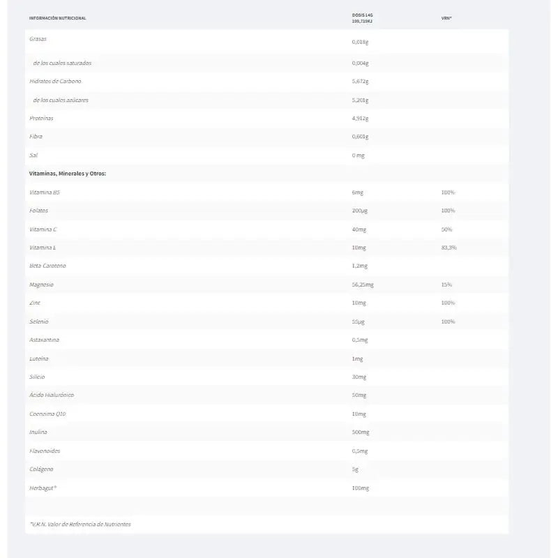 Natural wort sugar, collagen, citric acid, magnesium bisglycinate, inulin, camu camu extract (vitamin C), natural beta-carotenetric acid, magnesium bisglycinate, inulin, camu camu extract (vitamin C), natural beta-carotene (dunaliella salina algae), pine extract - flavonoids (Pinus silvestris), a mixture of plant extracts (Tinospora cordifolia, Hemidesmus indicus, Piper longum Linn, Alpinia galangal, Terminalia chebula Retz, Swertia chirata Buch, Murraya koeniggii, Curcuma longa and Zingiber officinale), steviol glycosteviol glycosides, zinc bisglycinate, hyaluronic acid, astaxanthin, DL-alpha-tocopheryl acetate (vitamin E), bamboo extract (Bambusa arundinacea), selenium-enriched yeast, lutein (Calendula officinalis), lutein (Calendula officinalis), lutein (Calendula officinalis).na (Calendula officinalis), Maltodextrin, Coenzyme Q10, Calcium D-Pantothenate (Vitamin B5), Pteroylglutamic Acid (Folate - Vitamin B9). Strawberry and Red Fruit flavourings, Beetroot Red colouring and Carminic Acid of natural origin.